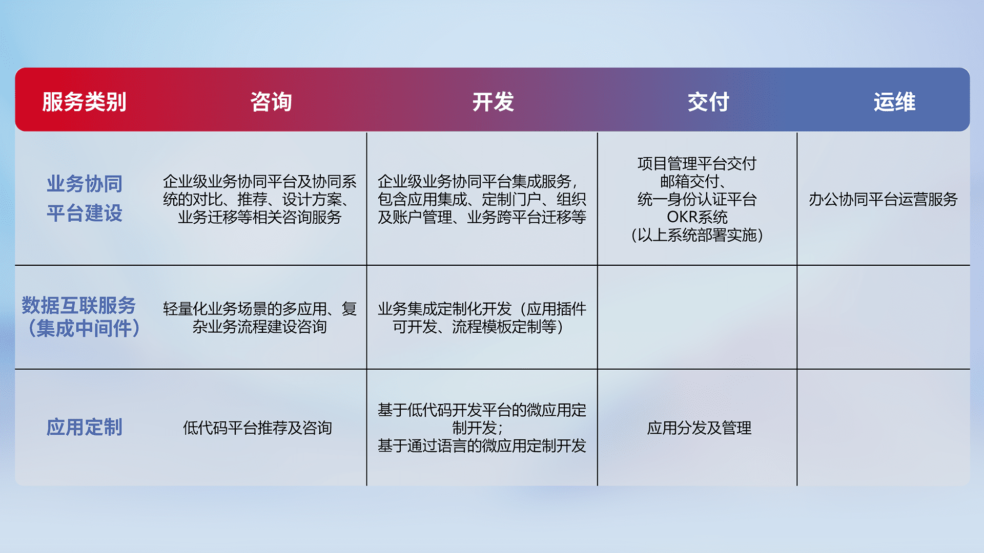 针对钉钉、、、企微、、IDaas等平台级产品提供产品的规划、、、方案、、交付、、定制化开发等服务,,实现如统一协同办公、、、、智能客户服务、、、、混合会议管理、、、智能数据查询、、、等业务场景,,,,实现数字化转型。。。。